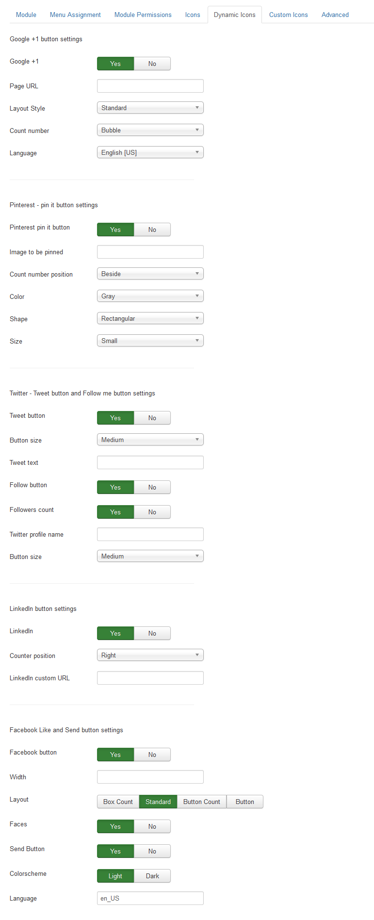 - dynamic buttons: twitter follow, tweet button, linked in, pinterest, facebook